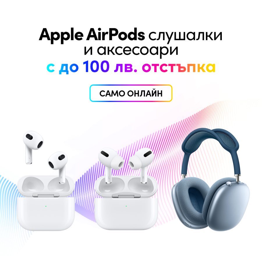 Актуалното поколение безжични слушалки AirPods имат стилен дизайн и кристално чист звук. Те включват множество иновации за подобряване качеството на звука и цялостното изживяване, като пространствено аудио, което разпространява звука навсякъде около нас и функция за динамично проследяване на положението на главата. В добавка вградената технология Adaptive EQ прецизира звука, съобразно особеностите на слушащия. Слушалките се управляват изключително лесно чрез сензор за натиск. Те са водоустойчиви, а батерията им издържа до шест часа слушане на музика с едно зареждане.