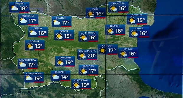 Минималните температури ще бъдат между 5° и 10°, за София – около 6°. Ще преобладава слънчево време. След обяд над крайните североизточни райони облачността ще се увеличи и на места там ще превали дъжд. Вятърът ще се ориентира от северозапад и ще е до умерен, в Дунавската равнина и в Горнотракийската низина временно ще се усили. Максималните температури ще бъдат между 16° и 21°, за София – около 16°. Атмосферното налягане ще се повишава и ще бъде близко до средното за месеца.