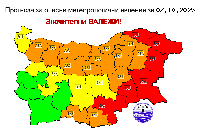 Предупреждение от първа степен - жълт код за интензивни валежи, е обявено за Централна и Североизточна България. Така обстановката ще бъде спокойна само в четири области на северозапад, а лошото време се очаква да продължи до сряда.