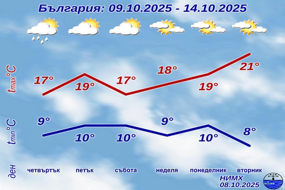 През следващите дни до края на тази и в началото на следващата седмица ще има повече и по-продължителни разкъсвания и намаления на облачността, на места до слънчево време. Само на отделни места в планините в следобедните часове са възможни слаби краткотрайни валежи. Ще продължи да духа умерен, в Дунавската равнина временно силен северозападен вятър. Преобладаващите температури ще бъдат: минимални между 7° и 12°, максимални - 16°-21°. В