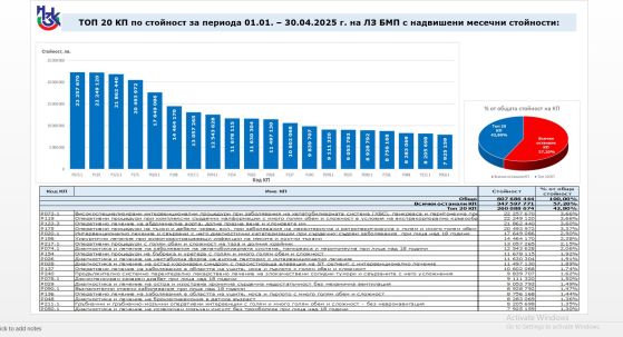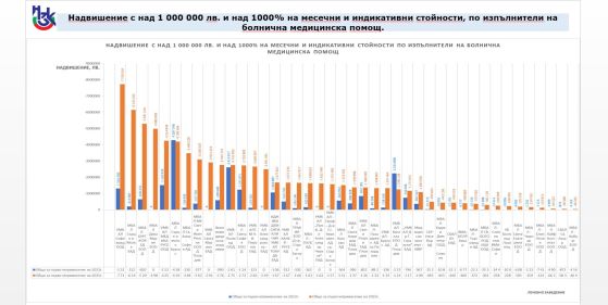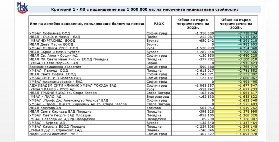 В Топ 5 по генерирани суми от надлимитна дейност са частни лечебни заведения. С най-голяма стойност на надлимитната дейност (надвишение над 1 млн. лв. на месечните индикативни стойности) е УМБАЛ "Софиямед", която за първото четиримесечие на тази година е отчела 7 718 234 лв., при 1 316 330 лв. през 2023 г. Следват МБАЛ "Сърце и мозък", Плевен - с 6 145 102 лв., при 212 078 лв. за същия период на 2023 г.; МБАЛ "Бургасмед" - с 5 291 210 лв. надлимитна дейност при 650 242 лв. през 2023 г.; МБАЛ "Дева Мария", Бургас - 4 982 603 лв. при 0 през 2023 г. и УМБАЛ "Медика" Русе - 4 254 848 лв. при 1 млн. 520 939 лв. през 2023 г.