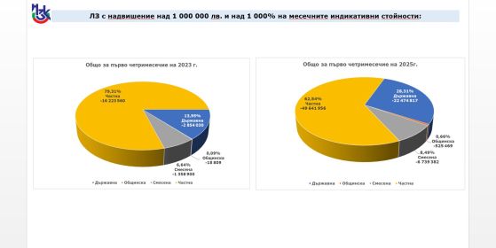 Основните "генератори" на надлимитна дейност са частните болници 62,54% през 2025, следвани от държавните 28,31%, запазва се тенденцията от 2023 г. когато частните лечебни заведения отново доминират.