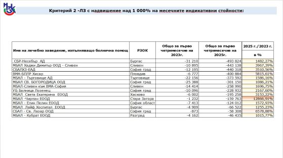 Анализирахме дейността на болниците по два критерия – болници с надвишения на индикативните бюджети с над 1 млн. лв. ( надлимитна дейност) спрямо 2023 г. и болници, надвишили с над 1000 % месечните си индикативни стойности. Има болница с над 12 000% (общинската болница в Чирпан) отчетена надлимитна дейност. Делът на държавните болници, които генерират надлимитна дейност, се увеличава с 10%, посочи Стефановски.