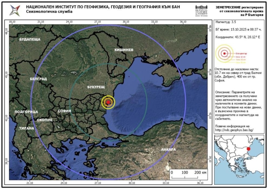Епицентърът е бил на 10,7 км от Балчик и на 400 км от София.