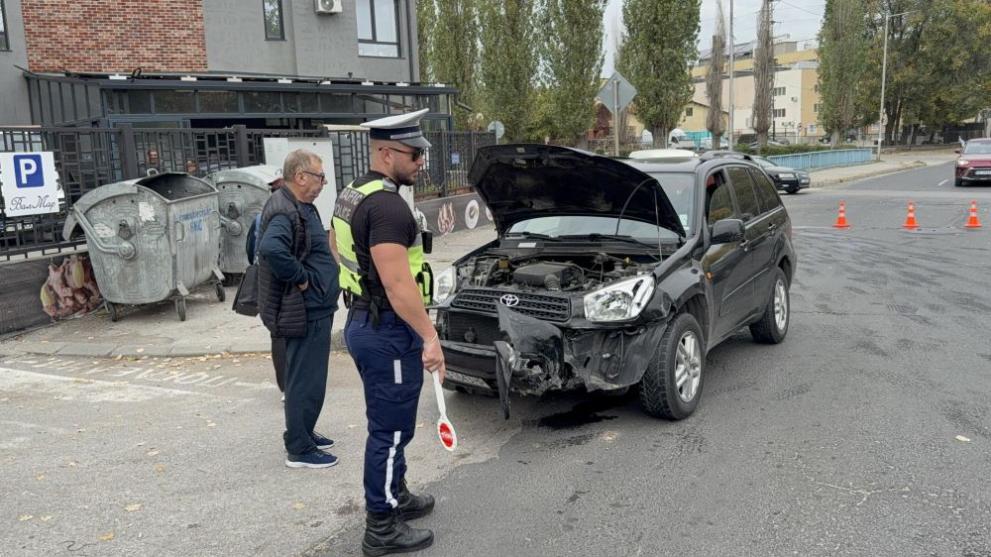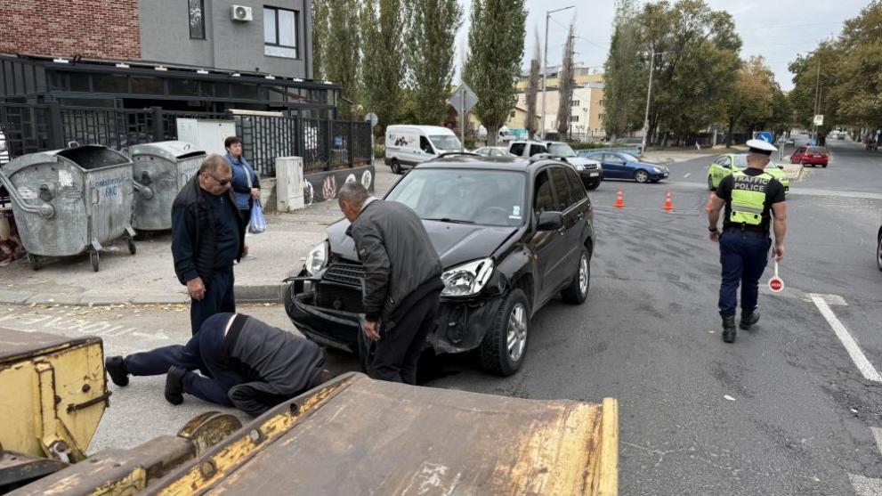Възрастен шофьор с джип не спря на знак "STOP" и се блъсна странично в автобус, превозващ деца на бул. "Васил Левски" в Хасково.