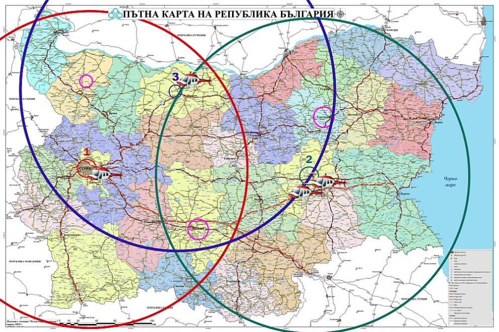 Определените имоти за изграждане на бази за хеликоптерите са 6 на брой. Към момента един хеликоптер е позициониран в оперативната база в София и два в Сливен. Новият хеликоптер вече се намира в Долна Митрополия. Останалите ще бъдат разпределени в Пловдив, Габровница (община Монтана) и с. Буховци (община Търговище).