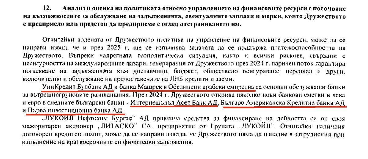 По информация на Mediapool петролната компания е била предупредена от "УниКредит Булбанк", че трябва да спре да използва сметките си във финансовата институция до 21 ноември. Тогава изтича преходния срок, даден от финансовото министерство на САЩ за прекратяване на всички транзакции на лица от САЩ и преводи през територията на страната, свързани със санкционирани активи на "Лукойл" и "Роснефт", сред които и "Лукойл България" и нейната "Лукойл Нефтохим Бургас", които са пряка собственост на швейцарската "Литаско", притежавана от руската "Лукойл".
