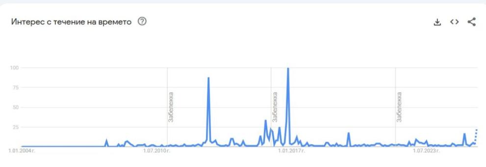 На 3 декември малко след 13.30 часа, когато се разглеждаше предложението на президента Румен Радев за провеждане на референдум с въпрос "Съгласни ли сте България да въведе единната европейска валута евро през 2026 г.", интересът към думата "референдум" рязко скача, както може да видите от графиката.