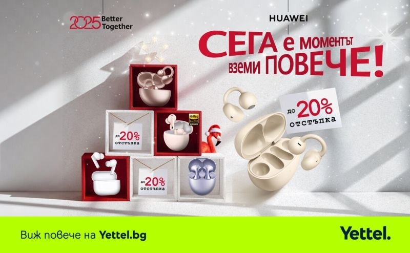 Коледният месец винаги носи онзи особен уют – светлините по улиците, ароматът на канела и портокал, тиха музика отдалеч и усещането, че всичко е малко по-топло, дори когато въздухът е изпълнен със студ. Именно сега Yettel поднася една от най-приятните изненади за сезона: до 20% отстъпка на безжичните слушалки HUAWEI FreeClip, FreeBuds 6 и FreeBuds SE 4 в периода от 2 до 30 декември. Безжичните слушалки са сред най-желаните подаръци – практични, модерни и полезни във всеки един ден. Но в празничния сезон те носят и своята магия: нищо не създава настроение така, както любимите коледни мелодии, звучащи в ушите ти, докато се разхождаш из украсения град или чакаш за чаша топъл шоколад на коледния базар. Така дори обикновената зимна разходка се превръща в личен празник, а този малък технологичен подарък носи емоция, която остава дълго след като празничните светлини угаснат. Всички аудио продукти на Huawei са съвместими както с Android, така и с iOS устройства, което ги прави универсален подарък – жест, подходящ за всеки, независимо от това какъв телефон използва.