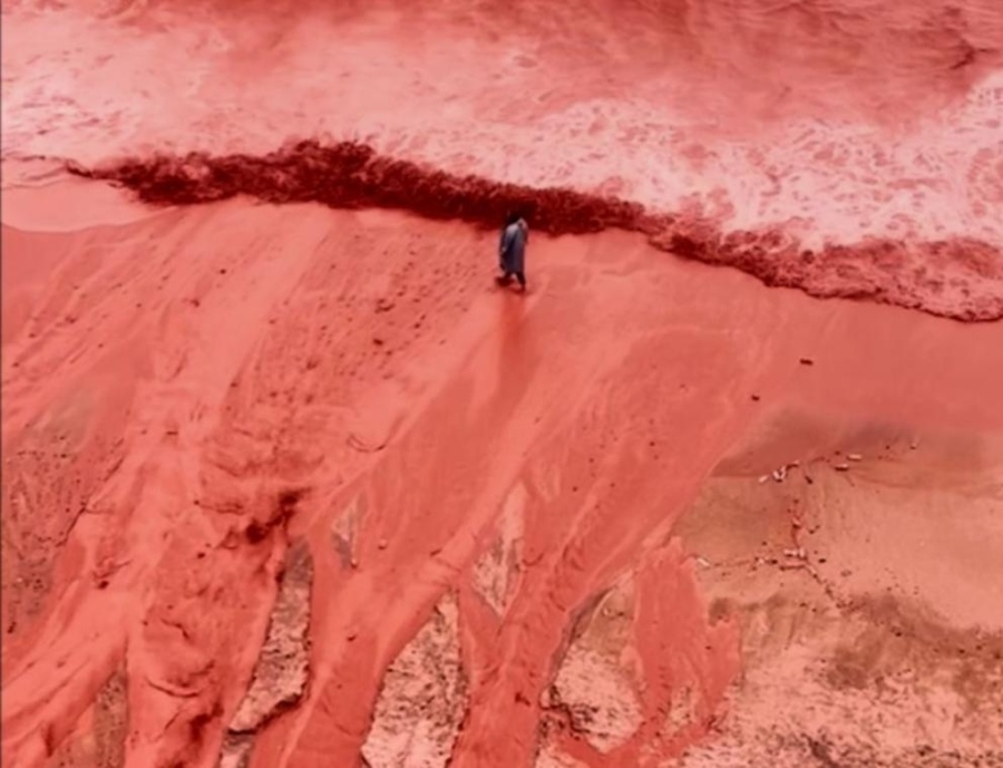 Зрелището се дължи на стичащите се по брега води, оцветени в наситено червени нюанси, които усилват наситеността на богатата на желязо почва на острова и я отмиват в морето.
