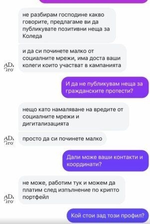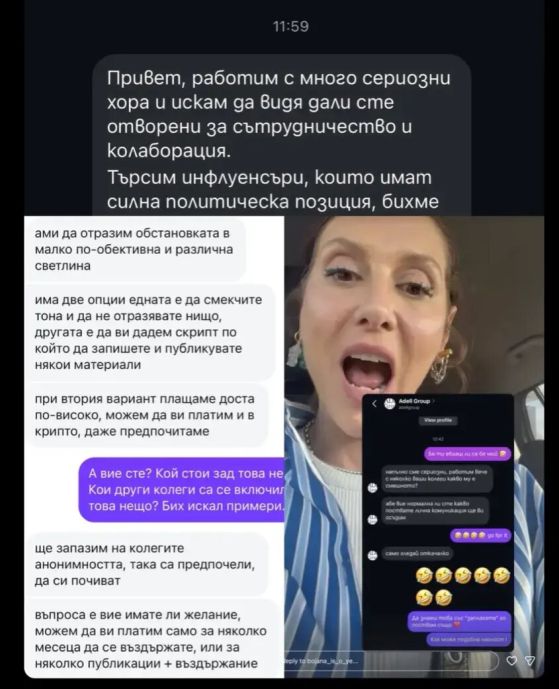 "Има няколко варианта: това да е истинско проучване на нагласите на съответните инфлуенсъри; това да е фейк предложение, с цел да се накарат инфлуенсърите да отговорят и да ги хванат в "противоречие"; това да е шега от някого, който иска да си направи съдържание за месеци наред. Засега мнозина отказват, като някои публикуват разговорите. Не е ясно дали има инфлуенсъри, които са приели. По постовете им ще се познае. Но е забавно как мнозина откриха този комуникационен инструмент - инфлуенсърите. И решиха да се включат в комуникационната война. Да видим. Чакаме развитие", обобщава Аламанов.