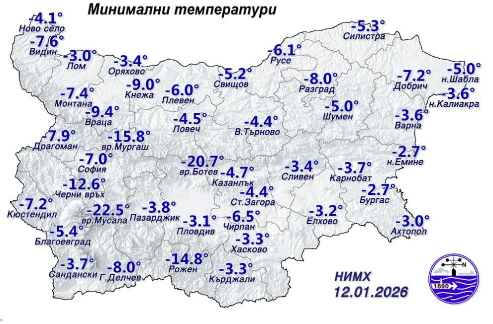 На връх Мусала днес бе регистрирана температура от -22,5 градуса, сочат данните на Националния институт по метеорология и хидрология (НИМХ). Това е и най-ниската температура регистрирана днес в страната.