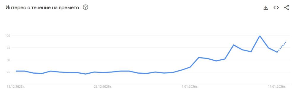 Нека преди това видим картината на интереса към Grok в САЩ - тя е съществено различна от българската. Данните сочат устойчив и висок базов интерес, който не пада до нулеви стойности, а се движи в диапазона 50–90 пункта, с отчетлив ръст в началото на януари. Това е потвърждение, че за разлика от тук, технологията е част от ежедневния публичен и потребителски разговор, а не просто реакция на единична новина.