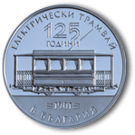 На обратната страна на монетата: изображение на първия трамвай с надписи – над него „125 ГОДИНИ“ на два реда, под него годината „1901“ и околовръст – „ЕЛЕКТРИЧЕСКИ ТРАМВАЙ В БЪЛГАРИЯ“. |