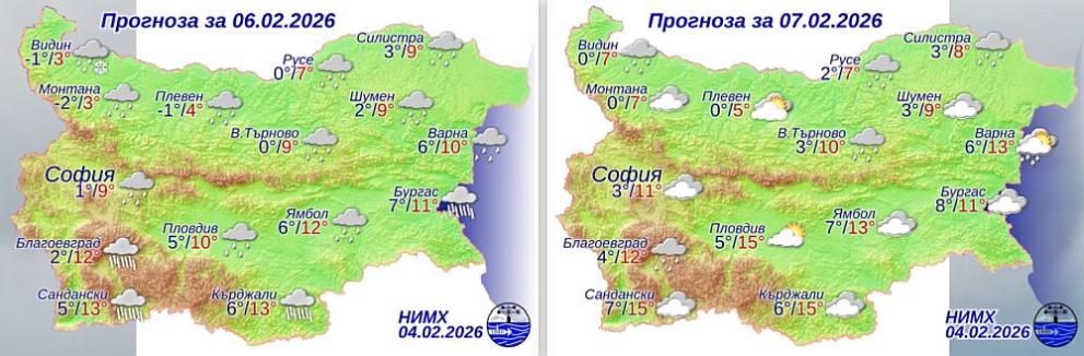 През следващото денонощие ще бъде облачно. През нощта от югозапад ще започнат валежи от дъжд, които през деня ще обхванат почти цялата страна. В западните и централните части на Северна България, където ще е тихо, ще има поледици. Значителни по количество ще бъдат валежите в Рило-Родопската област, на места в Източна България и централните райони на Стара планина. Ще духа до умерен вятър от юг-югоизток. Минималните температури в Северна България и високите полета на Западна ще бъдат между минус 6° и минус 1°, в южната половина от страната и по Черноморието - между 1° и 6°, в София - около минус 2°. Максималните температури в западните и централни части на Северна България ще бъдат между 0° и 2°, в останалата част от страната – предимно между 5° и 10°, в София – около 5°.