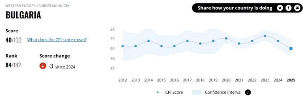 България заема едно от най-ниските места в Европейския съюз по борба с корупцията, сочи годишният доклад на „Трансперънси Интернешънъл“ за 2025 г. Страната получава индекс 40, равен само на този на Унгария, като отразява нарастващото влияние на частни интереси върху държавата и усилва призивите за действия срещу клептокрацията. Общественото недоволство расте, а ширещата се корупция остава сред най-големите предизвикателства пред демократичните институции в България.