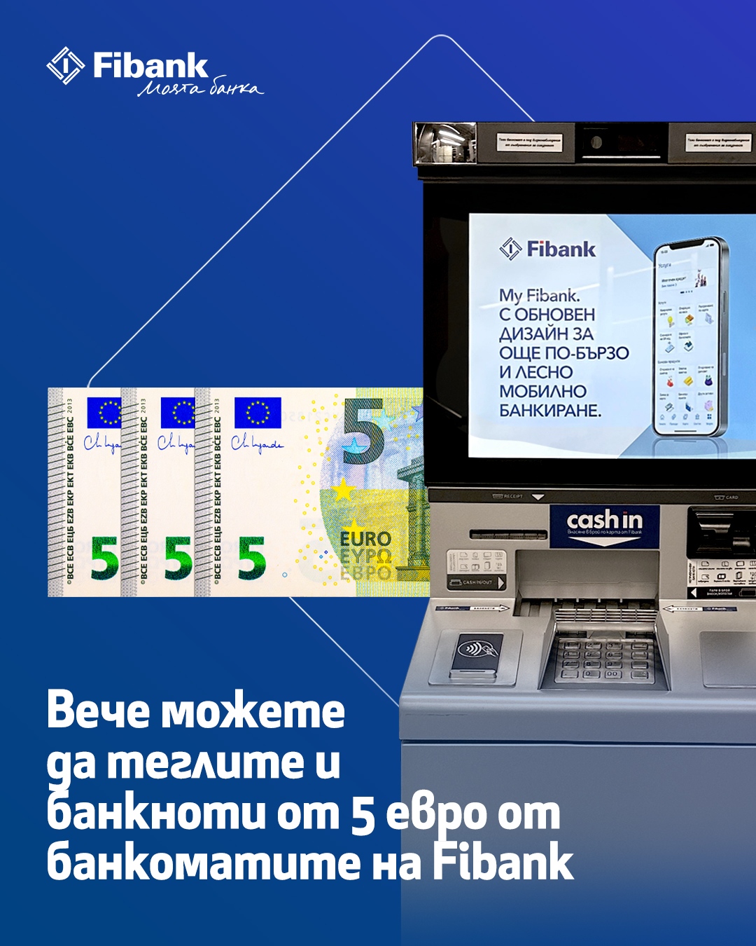 Fibank (Първа инвестиционна банка) продължава да разширява възможностите в полза на клиентите, като предоставя по‑голямо удобство и гъвкавост при използването на ежедневните банкови услуги. Клиентите на ПИБ вече могат да теглят от банкоматите ѝ евро банкноти с различни номинали: от 5, 10, 20, 50 и 100 евро.