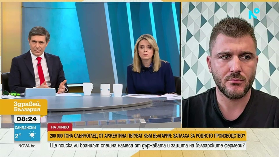 „В складовете има около 600 000 тона наличен български слънчоглед”, обясни той и допълни, че количеството, което пристига от Аржентина, представлява между 1/6 и 1/7 от цялото годишно производство на България, но влиза в страната за много кратък период - около 15 дни, което създава шок на пазара.