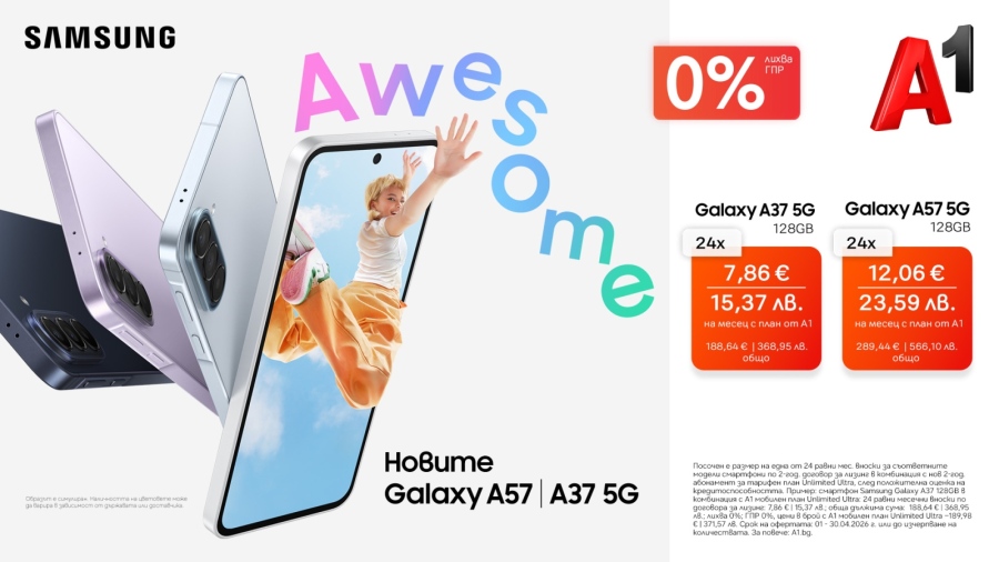 До 30 април Samsung Galaxy A57 5G 128 GB е наличен в А1 за 12,06 евро/23,59 лв. на лизинг с 0% лихва за 24 месеца с план Unlimited Ultra и в комплект с преносима батерия ttec ReCharger 10 000 mAh, a Galaxy A37 5G 128 GB – за 7,86 евро/15,37 лв. при същите условия.