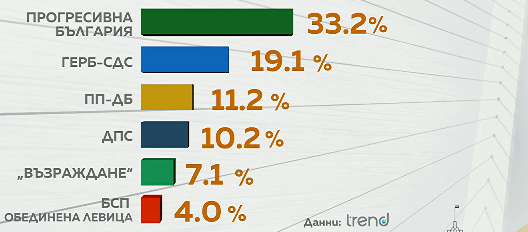 В подредбата следват „Има такъв народ” (2,1%), „Величие” (1,7%), „Алианс за права и свободи” (1,6%) и „Синя България” (1%), сочи проучването на „Тренд“.