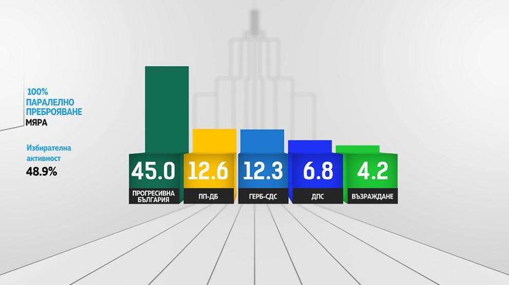 Данните на агенция „Мяра” от паралелното преброяване при 100% изпълнение на извадката показват, че „Прогресивна България” на Румен Радев печели категорично битката в предсрочните избори за 52-рото Народно събрание с 45,0% от гласовете.