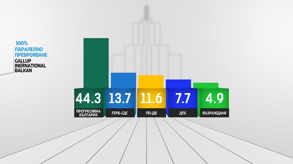 Данните на „Галъп Интернешънъл Болкан" от паралелното преброяване при 100% изпълнение на извадката също сочат, че „Прогресивна България” е победителят от предсрочния вот. Формацията на Румен Радев е подкрепена от 44,3% от гласувалите.
