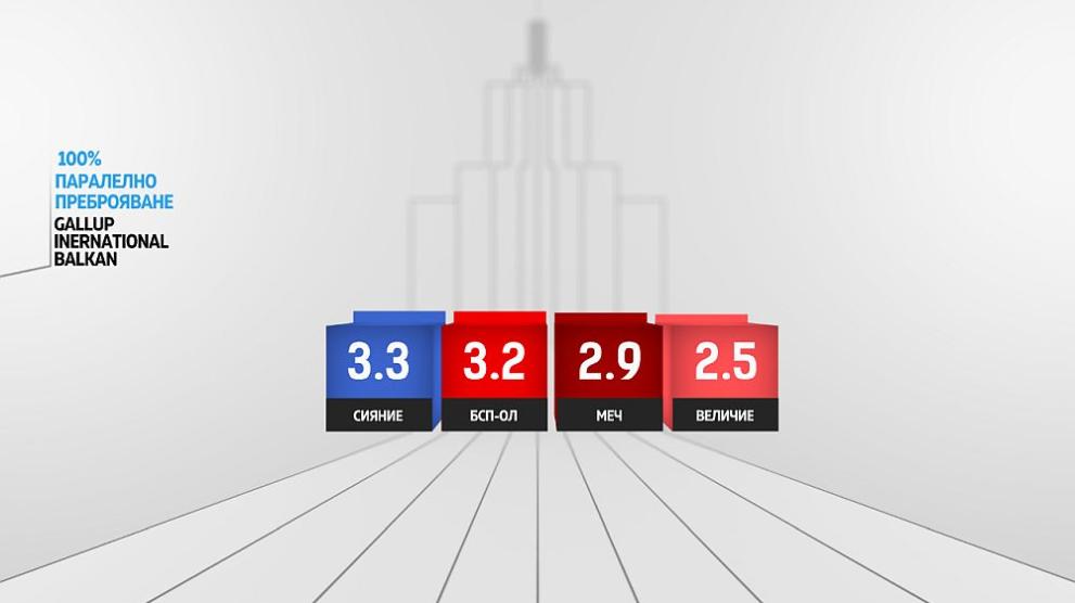 Под 4-процентната граница остават: "Сияния" с 3.3%, БСП - 3.2%, МЕЧ - 2.9% и "Величие" - 2.5%.