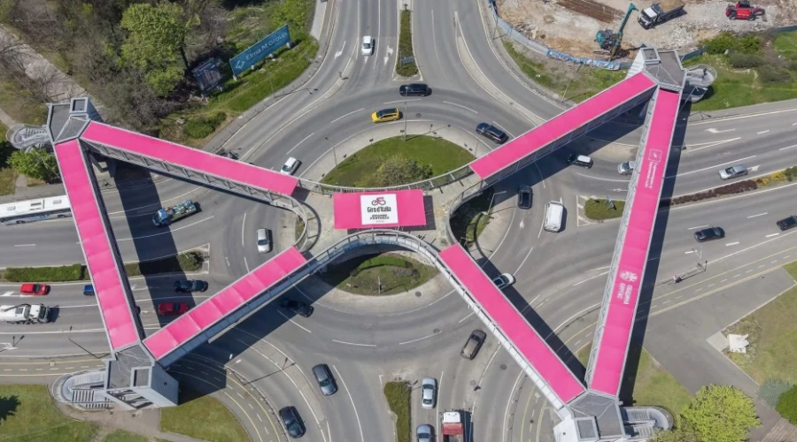 Междувременно пасарелката на кръстовище „Трапезица“ вече е в розово – емблематичният цвят на обиколката. Тя е опакована в цвета на „Джирото“ с розов плат и е изключително атрактивна.