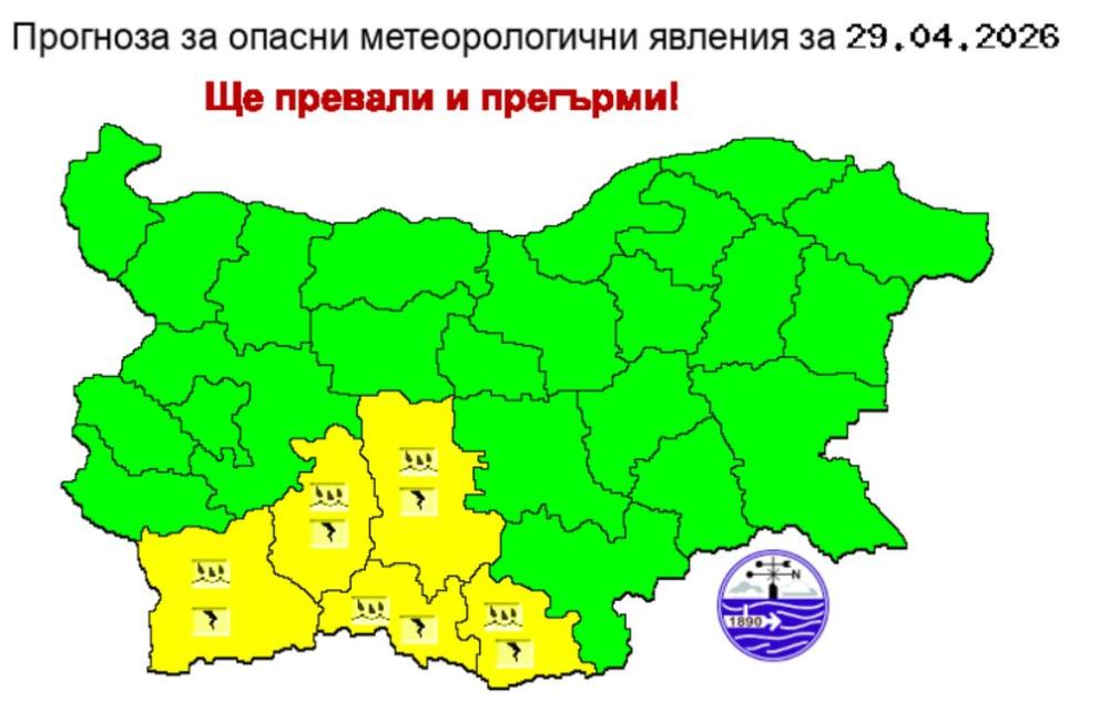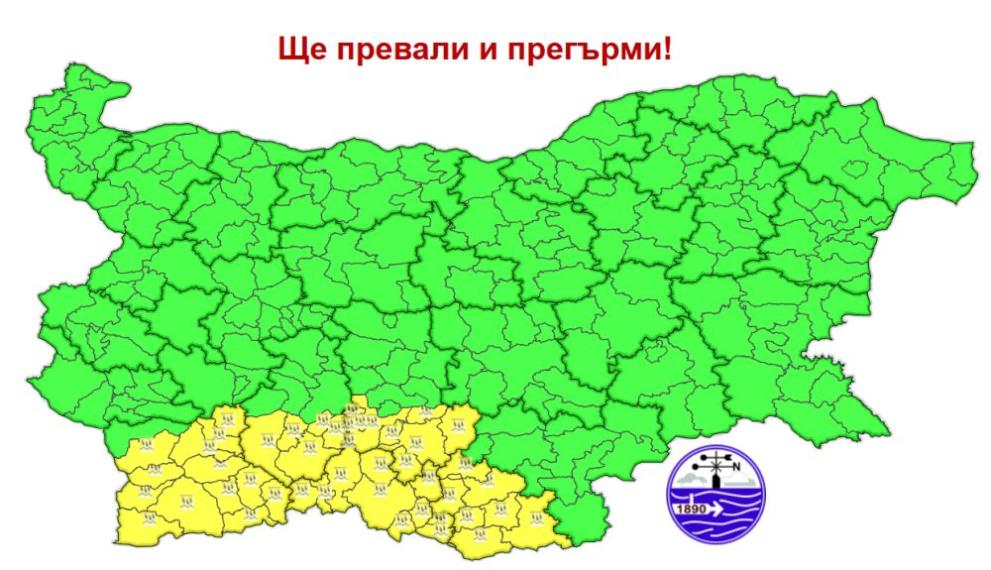 Предупреждението е в сила за областите Благоевград, Пазарджик, Пловдив, Смолян и Кърджали.